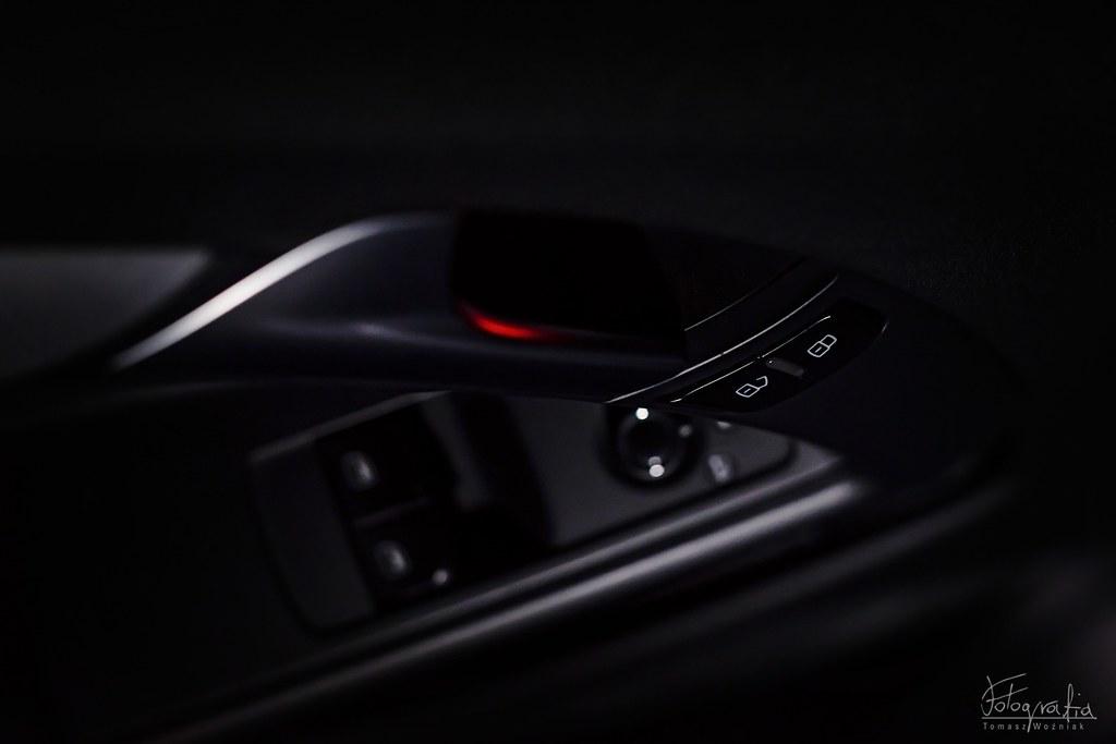Uważam, że niesamowitą robotę robią subtelne podświetlenia kilku detali na czerwono, np. klamek. Bardzo ciężko to pokazać na zdjęciu, bo to widać dobrze dopiero w zupełnej ciemności, wtedy cała klameczka "świeci się" po krawędzi aluminium, zajebisty efekt (na foto widać tylko fragment)! A elementu, który świeci (ledowy pasek) zupełnie nie widać, powiem szczerze zobaczyłem go dopiero wczoraj, robiąc zdjęcia z poziomu siedziska fotela :D