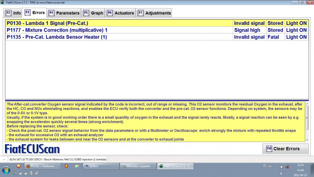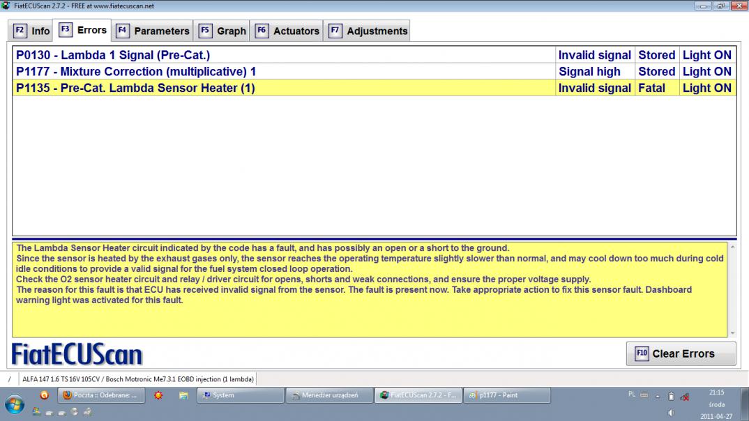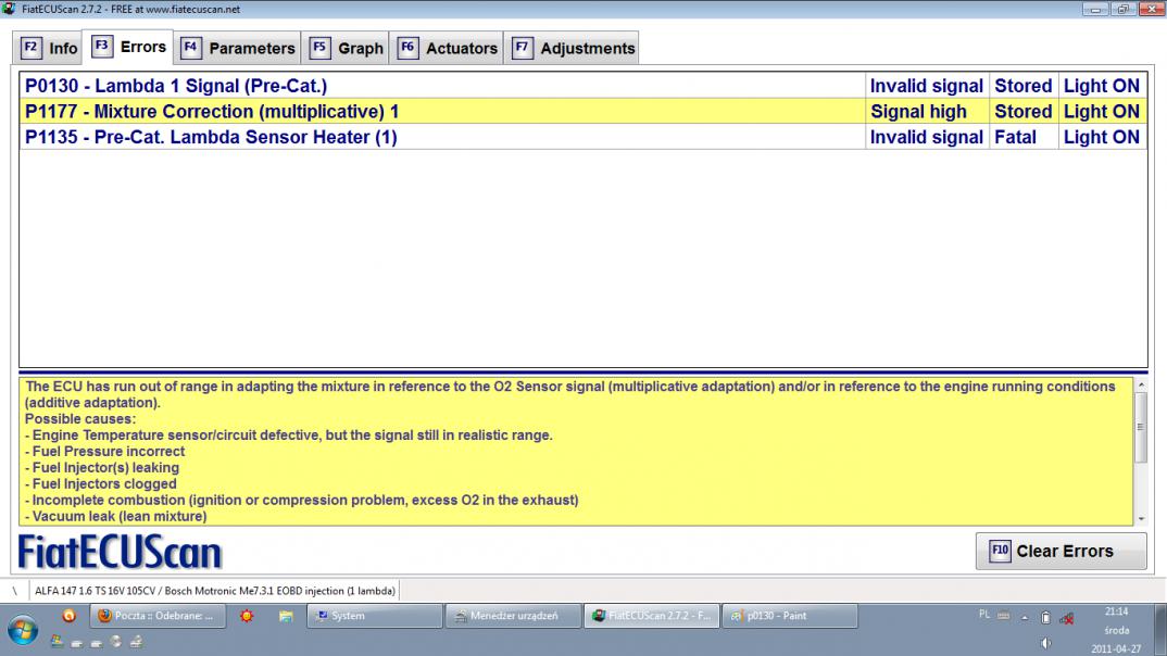 Po skasowaniu błędów silnik odpalił i pracował już normalnie. Po rozgrzaniu jednak błędy P0130 i P1135 powróciły ale puki co bez wpływu na pracę silnika (MSCF na razie się nie zapalił).