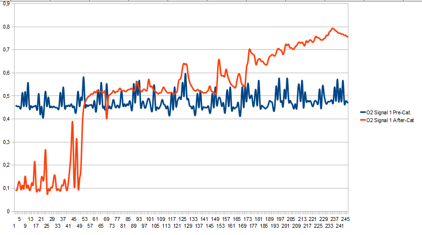 - widac że sonda za katalizatorem łapie temperaturę, wykres napiecia sie zmienia