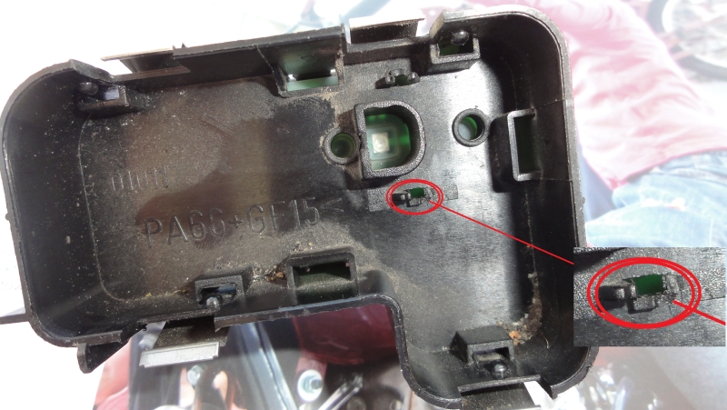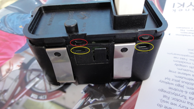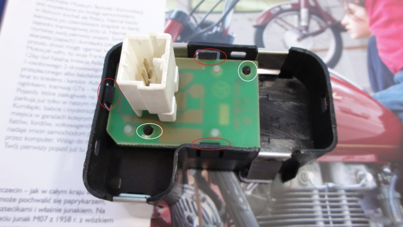 8 - mocowanie elektroniki, ()czerwone - wypustki mocujące, ()białe - bolce mocujące