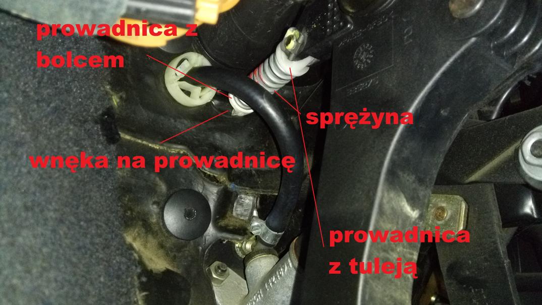 Dzisiejszego poranka w trakcie jazdy poczułem jakąś część pod butem. Po zatrzymaniu się okazało się, że pod pedałami znajduje się taki biały "dzyndzel". Ciężko mi określić od czego to jest i z czego wypadło. Natomiast po drugiej strony podłogi od kierowcy znalazłem jeszcze ułamaną sprężynę.