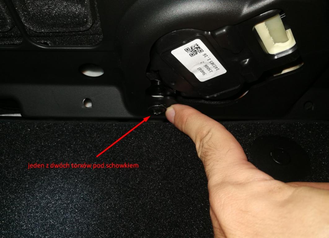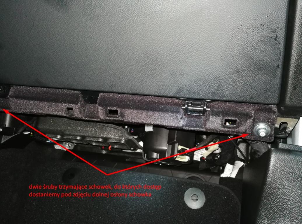 W schowku mamy 3 torxy, które odkręcamy. Pod schowkiem natomiast, od przestrzeni na miejsca dla pasażerów mamy dwa dodatkowe torxy.