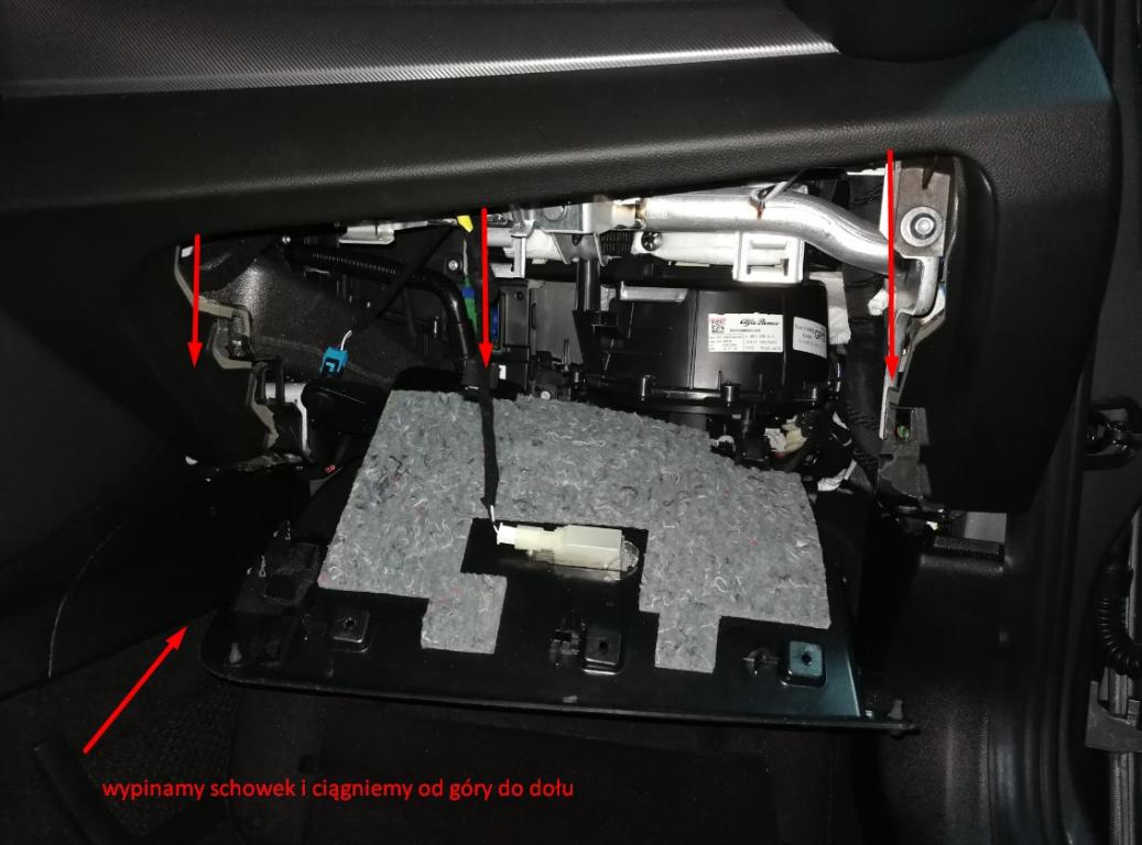 Po odkręceniu dołu, szarpiemy równomiernie po obwodzie dolnej osłony schowka (od nóg pasażera, tam gdzie odkręcaliśmy 2 torxy przed chwilą), która siedzi na spinki.
