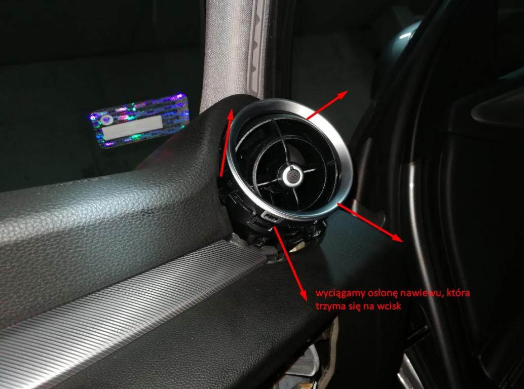 Szarpiemy za osłonkę nawiewów, aż lekko wyjdzie i możemy wyciągać wyświetlacz, który też trzyma się na spinkach - robimy to raczej równomiernie z lewej i prawej żeby nie połamać wyświetlacza, cholerstwo ciężko wychodzi.