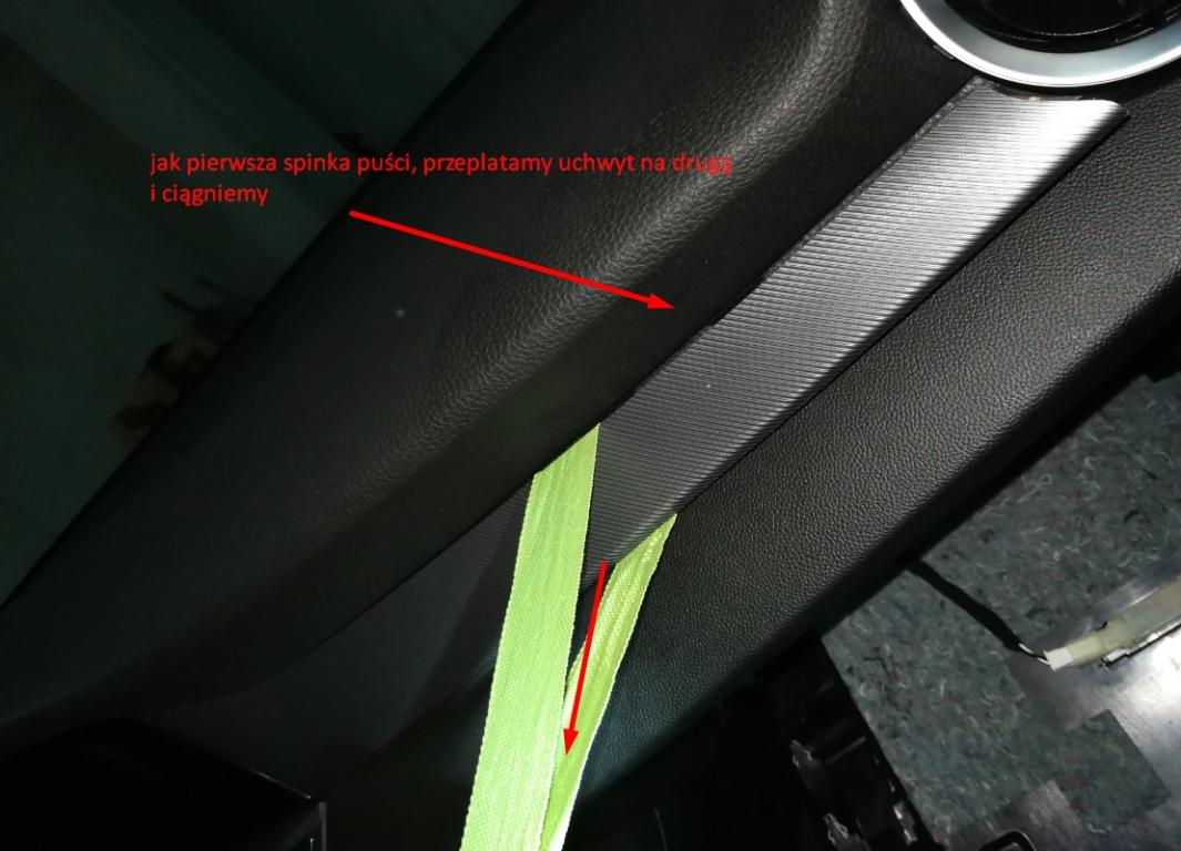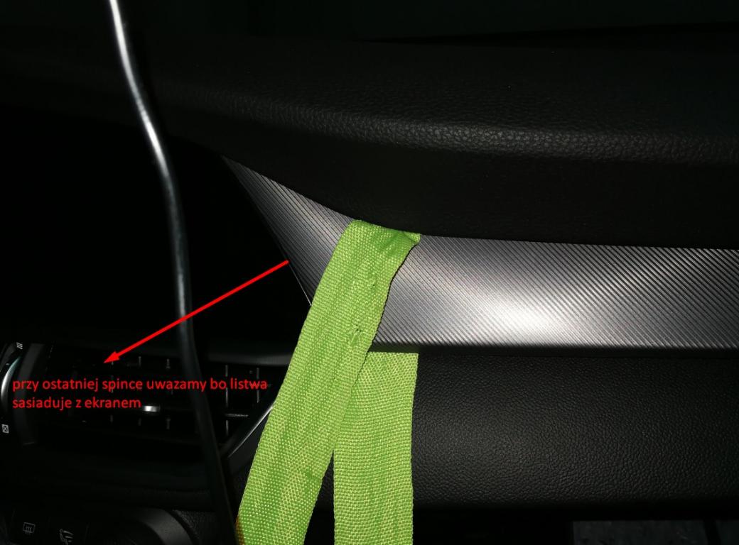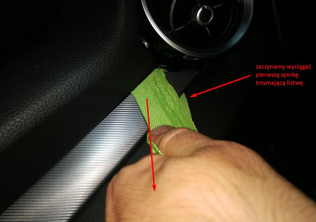 Możemy przystąpić do demontażu listwy. I tutaj trochę uzupełnienia. Ja nie walczyłem ze spinkami od środka, ale wykorzystałem mój sprawdzony patent na wszelkie listwy trzymające się na spinki. Musimy poświęcić jedną torbę na zakupy (taką, która bez problemu daje radę kilku zgrzewkom piwa) - ja miałem z Auchan, polecam Ucinamy jedno ucho takiej torby i mamy problem listew z głowy. Przeplatamy taką taśmę pod listwą i po kolei szarpiemy lekko aż spinka wyjdzie. Ciągniemy aż spinka lekko wyjdzie, a nie całkiem... przechodzimy do następnej aby listwa wychodziła w miarę równomiernie. Jak wyjdzie to przeplatamy za spinką, która wyszła i ciągniemy aż wyjdzie następna. Szybko i łatwo. Mamy pewność, że listwa się nie porysuje i nacisk jest w miarę rozłożony w stosunku do podważania np. śrubokrętem, co odradzam. Zdecydowanie najwięcej uwagi należy poświęcić ostatniej spince, tej przy wyświetlaczu, żeby jak puści nie porysowała wyświetlacza.