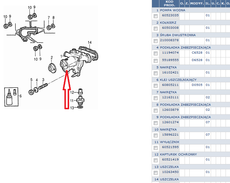 Pod moją Bellą zauważyłem dziś niewielką plamę płynu chłodniczego. Po oględzinach okazało się, że to nie wina węża (tym razem!!), a pompy wody. Z tego co wymacałem, płyn powoli sączy się otworu znajdującego się od spodu pompy ok 10mm od koła pasowego. Wygląda to tak, jakby czegoś tam brakowało. Jak to wygląda u Was? Poniżej zdjęcie z epera z zaznaczonym przybliżonym miejscem wycieku.