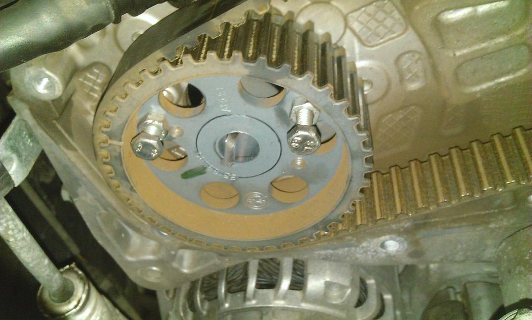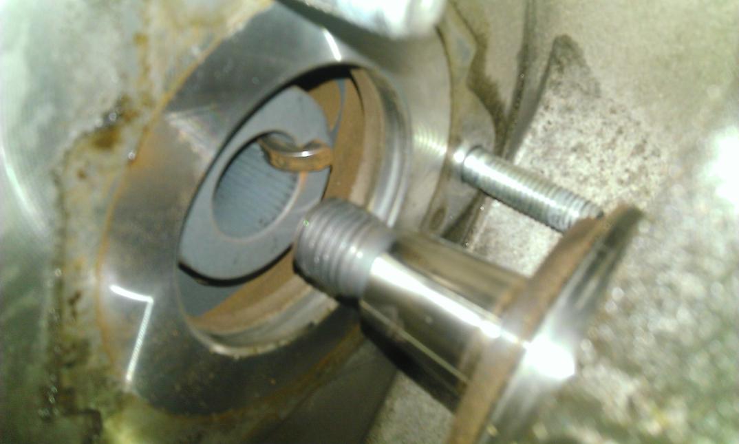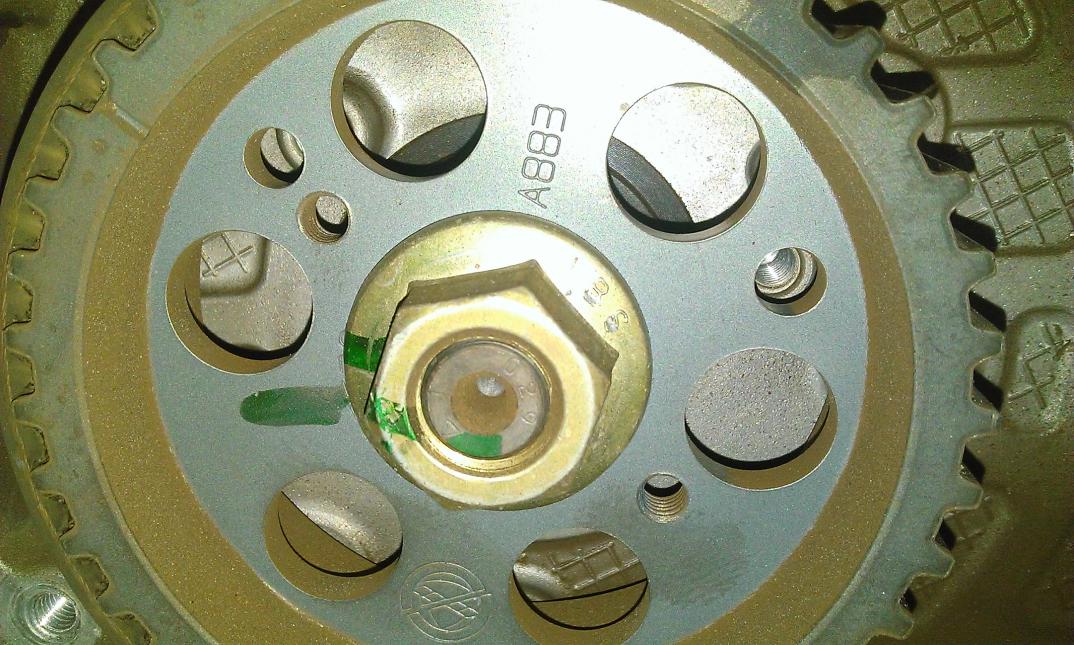 Teraz interesuje nas koło zębate pompy CR, ustawiamy ją tak (kręcąc wałem korbowym) aby większe nie symetryczne otwory pasowały na gwint który jest za nim. Pastępnie blokujemy koło, ja zrobiłem to dwoma śrubkami na 10klucz plus kontry. Możemy odkręcić tą dużą centralną nakrętkę.