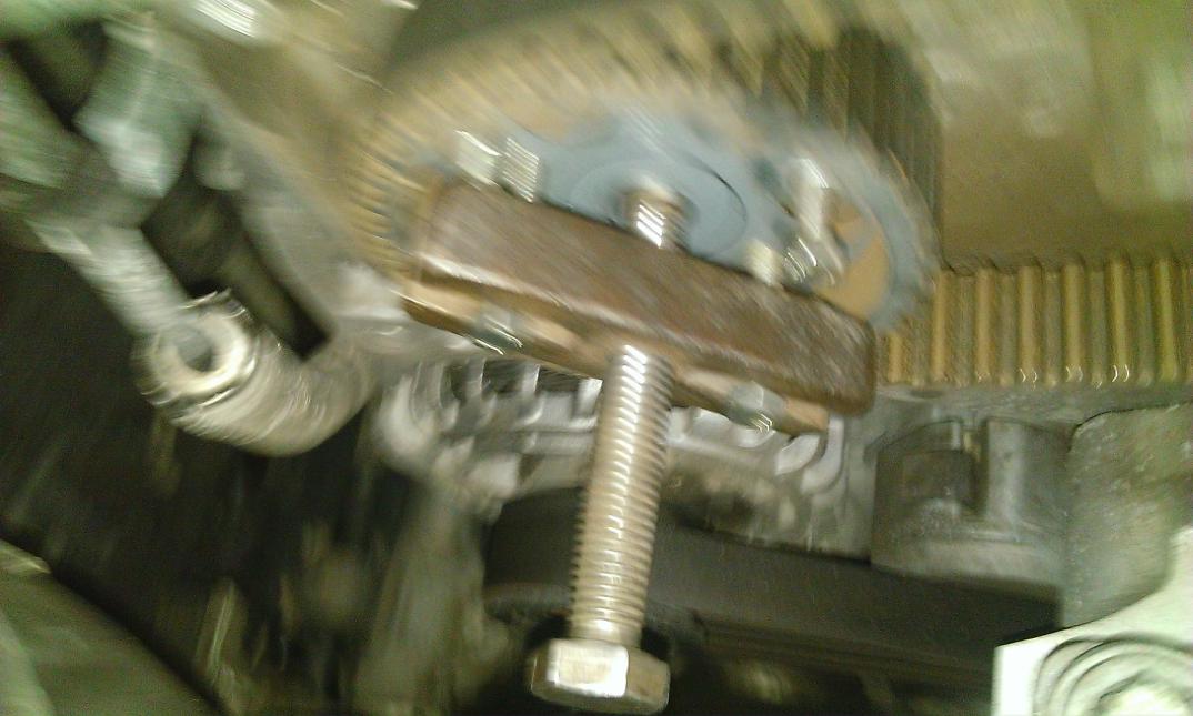 Mamy uwolnioną pompe ale ona ani drgnie bo jest osadzona na stożku i na klinie więc zaczynamy dokręcać ściągacz idzie ciężko, coraz ciężej aż nagle Pyk i stożek pusćił