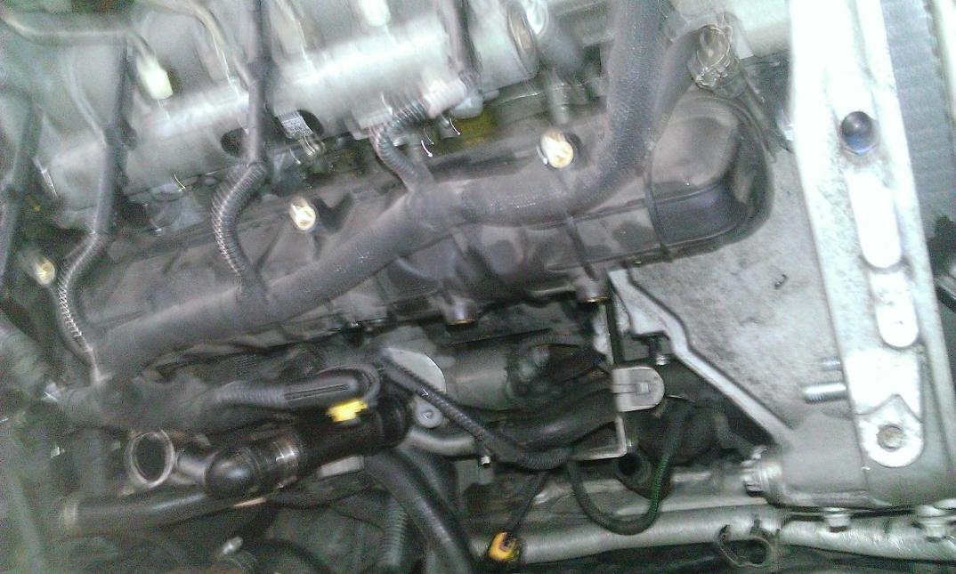 Następnie demontujemy pozostałe rurki z płynem chłodniczym i także możemy odłączyć świece żarowe dla większego manewru. Teraz mamy dostęp do wszystkich nakrętek kolektora. więc go demontujemy. Niech nie przerazi kogoś to że nagle zacznie sie lać płyn chłodniczy, gdyż w kolektorze jest kanał wodny po lewej stronie.