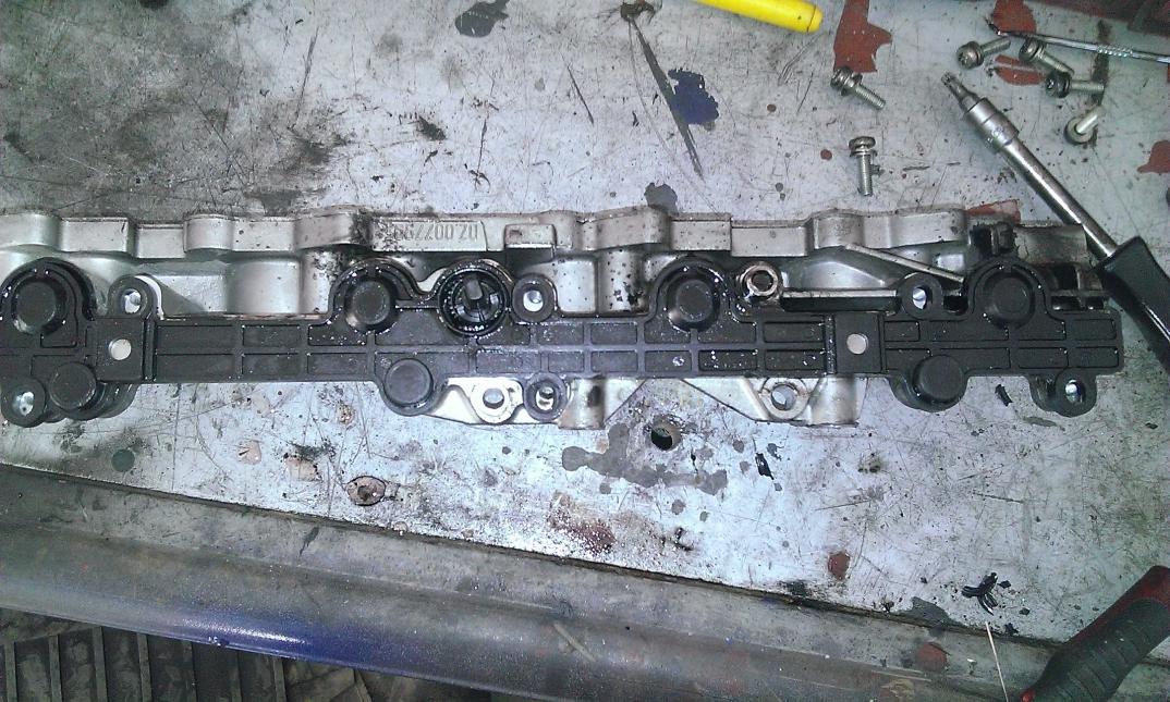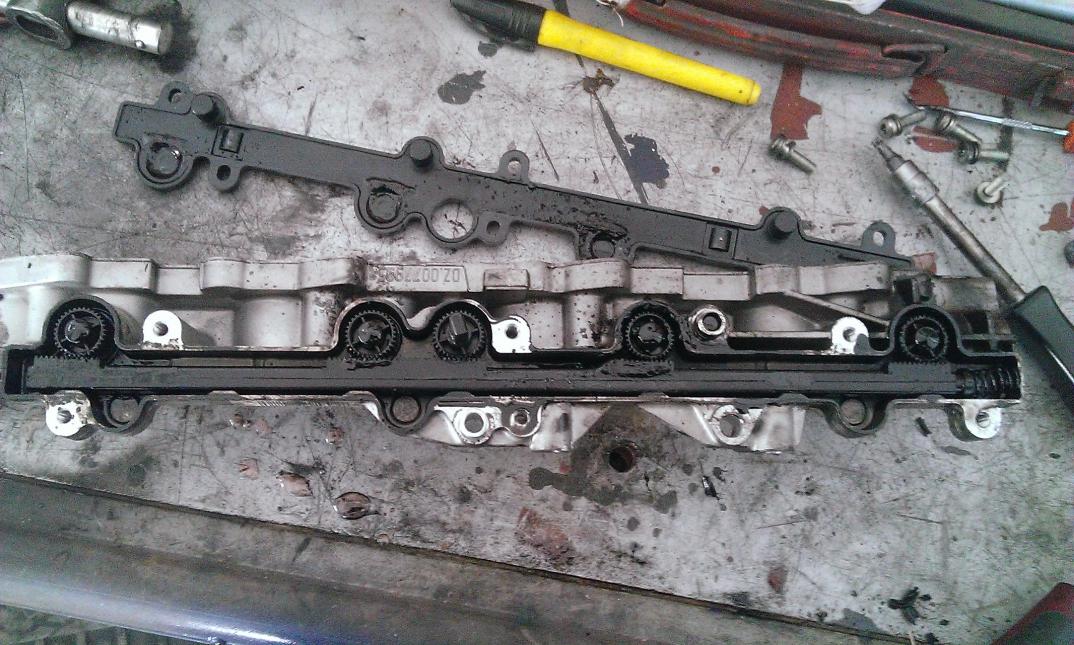 Odsłania nam się teraz cały mechanizm sterowania klapkami, tutaj zintegrowane z kolektorem, w aluminiowym całym połączone cięgnem. tutaj trzyma się to na 3 śrubkach torx a jedna jest ukryta zaraz od strony głowicy w elemencie aluminiowym kolektora, demontujemy to wszystko.