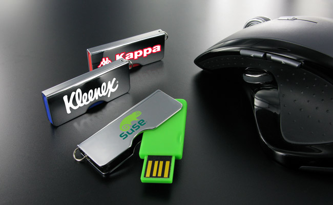 Rotator PenDrive USB. Z błyszczącej metalowej obudowy rotacyjnie wysuwa się ramię PenDrive'a do podłączenia do portu USB. Zewnętrzną obudowę można grawerować laserowo lub nadrukować sitowo. Kółko w rogu PenDrive'a pozwala na łatwe mocowanie do kluczy lub paska na szyję.