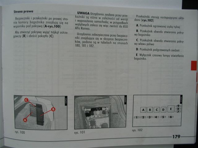 Wszystkie wymienione przez Ciebie urządzenia są sterowane przez bezpieczniki i przekaźniki w bagażniku po prawej stronie, rys. 102. Sprawdź przewody dochodzące do grupy bezpieczników/przekaźników. Tapicerkę zdejmiesz odkręcając plastikową nakrętkę koło lampy i wyciągając dwa kołki plastikowe z przegródki na drobiazgi z prawej strony.