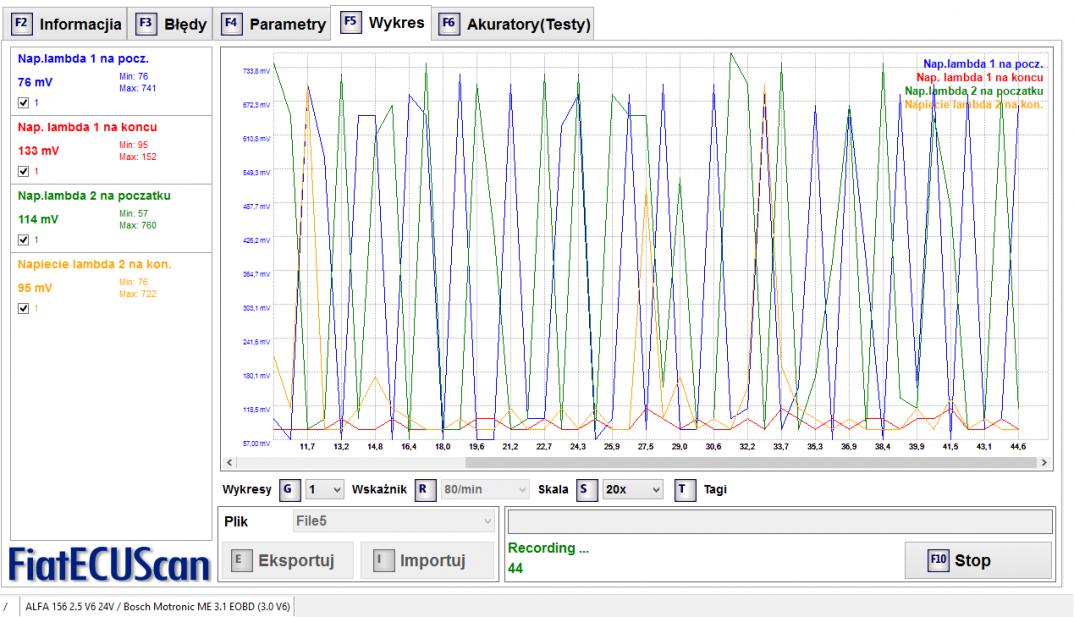 dziś wyskoczył mi błąd (nie pamiętam już dobrze jaki chodziło coś o mieszankę, po skanowaniu się nie pojawił). Postanowiłem zbadać jak wyglądają sondy lambda. Zrobiłem wykresy, czy ktoś mógłby zajrzeć na nie fachowym okiem? Wiem, że sondy powinny oscylować pomiędzy 0-1V. Czy u mnie jest wszystko ok? Z góry dziękuję za pomoc.