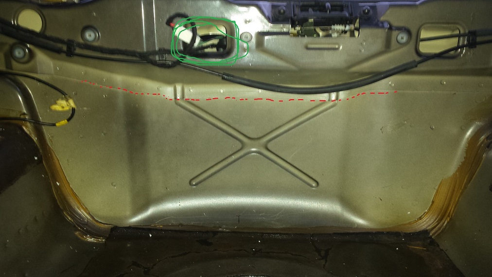 Witam, ostatnio przez przypadek zobaczyłem ze gromadzi mi się woda we wnęce koła zapasowego. Wczoraj znalazłem czas i próbowałem dojść do źródła przecieku i udało się ;) lecz teraz mam problem gdyż nie wiem jak zatamować ten przeciek. Woda leci mi przy łączeniu blach bagażnika ( miejsce przecieku zaznaczyłem czerwoną linię) Natomiast wkładając palec do otwór zaznaczony kolorem zielonym można wyczuć małe jeziorko :)