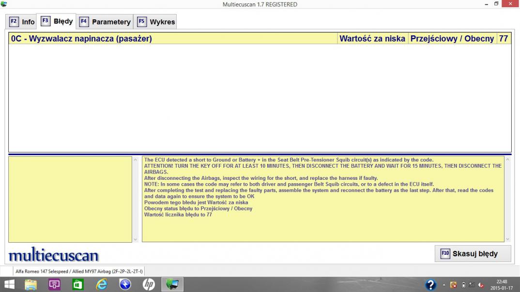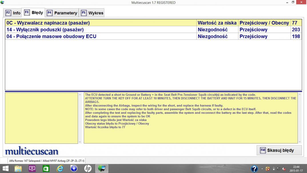 Zaczęła świecić mi kontrolka poduszek - ta czerwona :), więc podpiąłem sobie kompa i pokazały się następujące błędy: