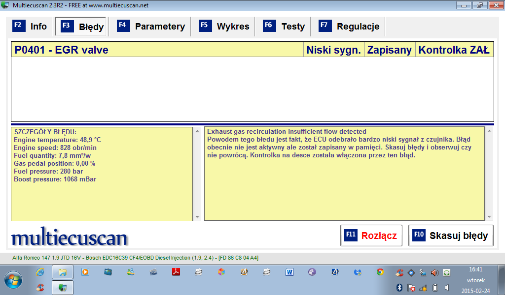 Od kilku dni mam pewien problem, moja Bella tak jakby straciła moc, szczególnie jest to widoczne rano kiedy odpalam ją po nocy, ruszam, i do 2 tysięcy obrotów auto zbiera się bardzo opornie, później jak się rozgrzeje to jest już trochę lepiej ale dalej mam wrażenie że gdzieś ta moc (150 KM) nie jest taka jak być powinna. Jak auto było rozgrzane to docisnąłem ją na postoju do 4,5 tysięcy obrotów i trochę dużo spalin wydostało się z rury(ciemny dym), zainwestowałem w kabelek i podłączyłem się do MES'a i wyskoczył błąd P0401. http://www.forum.alfaholicy.org/atta...d=158153&stc=1