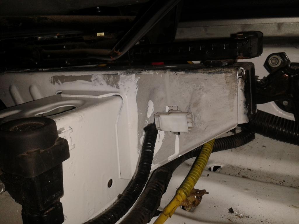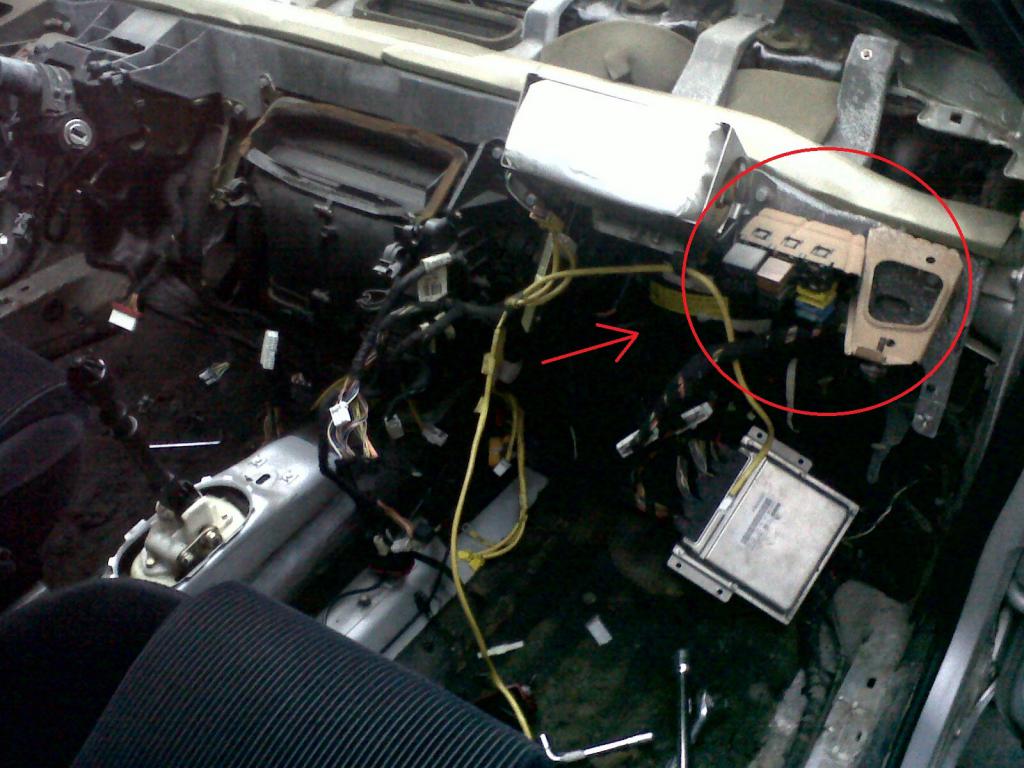 Czy w tym miejscu nie powinien znajdować się przekaźnik i bezpiecznik nie powinien być zamontowany? Kolor żółty wydaje się być odpowiedzialny za poduszki. Zdjęcie przedstawia fragment znajdujący się za deską rozdzielczą przy poduszce pasażera.