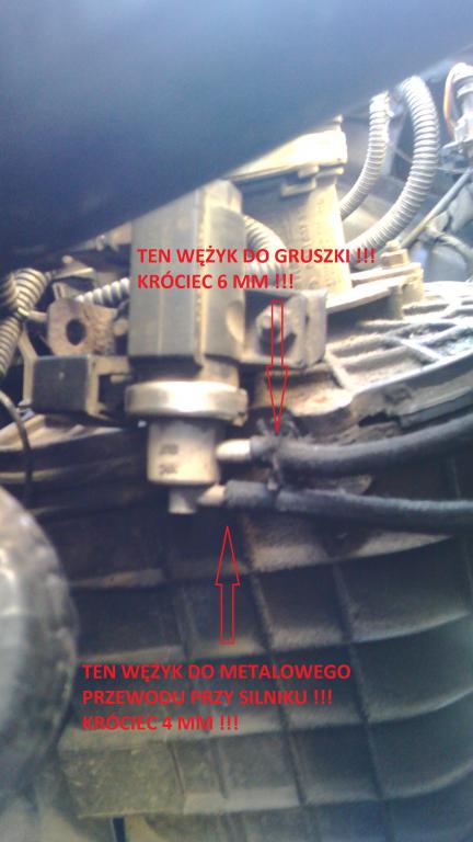Witam, mam taki problem ostatnio mam problem z czujnikiem VGT. Auto nie odpala, a po odpięciu wężyka i podpięciu na nowo do zaworu problem ustaje. Z tego co przeglądałem forum zauważyłem, że moje wężyki to jedno wielkie "G" ktoś założył zwykłe. Chce je zmienić(zanim wymienię zawór) ale chciałbym się upewnić czy są dobrze założone do czujnika. Zauważyłem, że są dwa rozmiary króćców przy czujniku jeden ma 4 mm, a drugi 6 mm. Tak samo jest przy gruszce jest 4 mm , a przy silniku (metalowy przewód) 6 mm. I teraz pytanie do was: