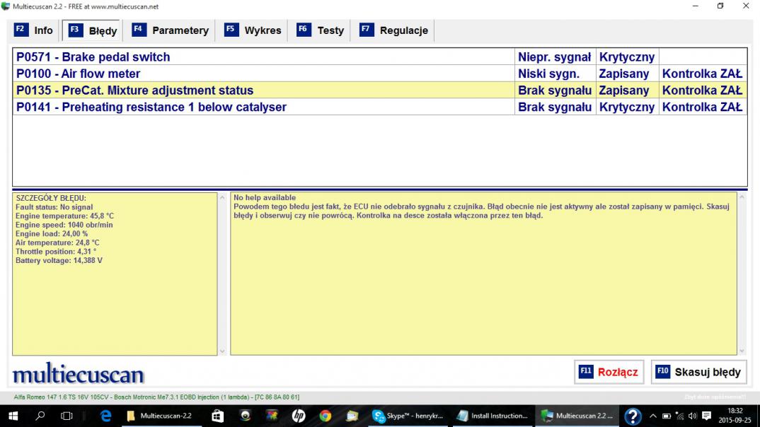 Sonda za katalizatorem ma chyba uszkodzoną grzałkę ewentualnie nie dostaje zasilania. Masz uszkodzony bądź zabrudzony czujnik położenia pedału hamulca i uszkodzony przepływomierz.