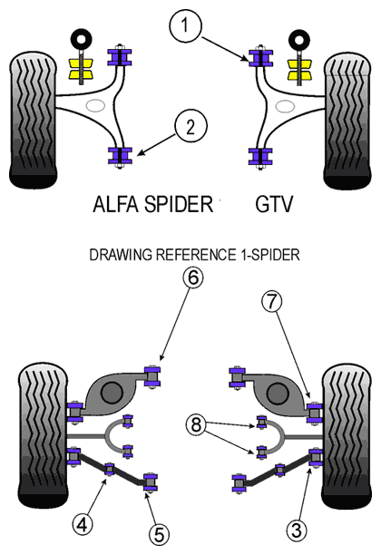 mam pytanie bo przy mocnym skręcie felga prawdopodobnie trze mi o wahacz. Zauważyłem że tuleje na wahaczu najbardziej tylnym (do którego jest mocowany amortyzator) te od strony środka auta mocno pływają, prawie dotykają ramy. Czy te tuleje (nr 5 na rysunku) są pływające czy może moje są wyjechane?