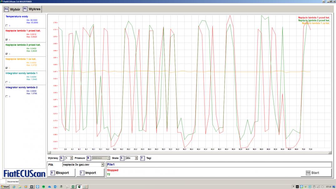 Poczekałem aż samochód się nagrzeje, wykonałem test napięć. Na jednym screenie jest podczas spokojnej pracy na jałowym, a na drugim przegazowałem go 4 razy żeby sprawdzić jak zachowuje się wykres. Konkretnymi wykresami uzupełnię wątek w późniejszym czasie, widziałem że robicie 4 wykresy na jednym screenie ze wszystkimi waznymi parametrami ale przyznaje się - nie miałem już czasu żeby to dokończyć w ten sposób ;)