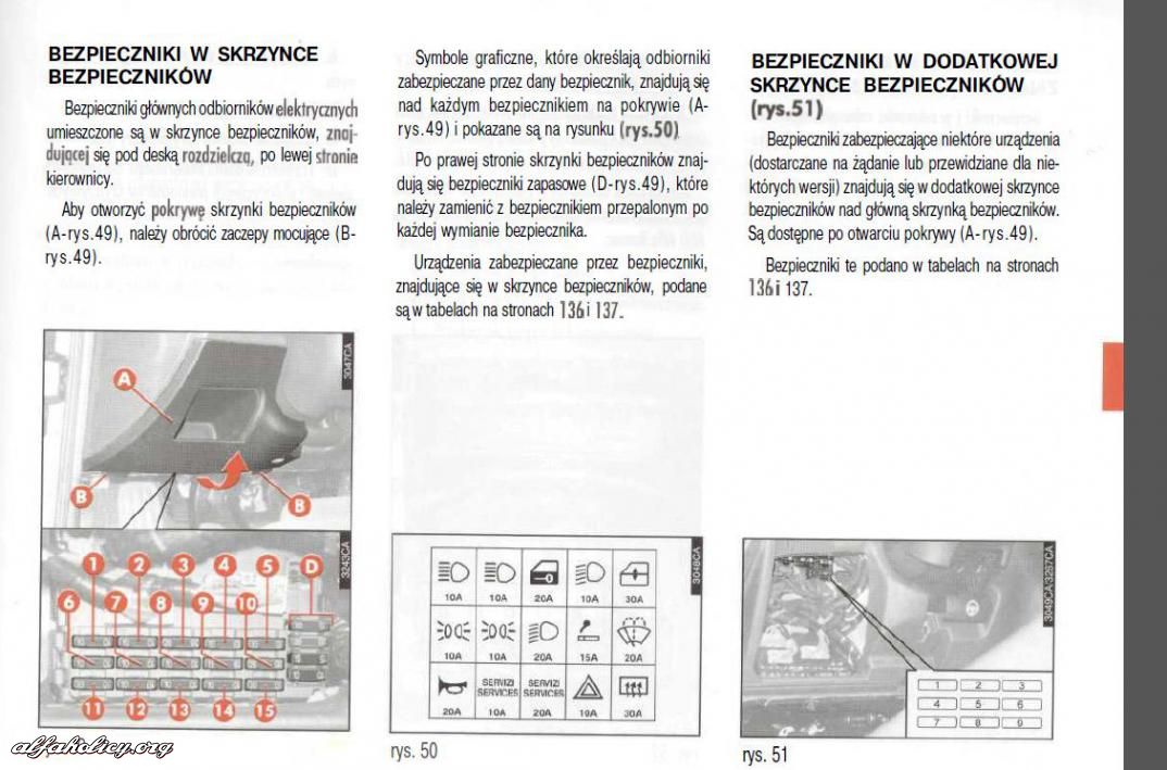Chciałem dojechać na stację kupić bezpiecznik. Nie wiem co mnie podkusiło uznałem, że pożycze na czas przejazdu bezpiecznik (rys 51) nr 4 lub 7 i sprawdzę czy auto pojedzie dzięki czemu odzyskamy kierunkowskazy. Auto z odpiętym bezpiecznikiem nr 4 i 7 nie odpaliło. Wróciłem z wszystkimi bezpiecznikami na pierwotny stan i odpaliłem auto. Auto nie wiem czy to poprawne określenie weszło w tryb awaryjny. Brak reakcji na pedał gazu. Oddałem auto do norauto gdzie wykasowali błędy auto do stanu pierwotnego. Kupiłem u nich nowy bezpiecznik wpiłem go na miejsce od klimatyzacji i tu zaczęły się problemy. Z wpiętym bezpiecznikiem od klimatyzacji auto odpala ale gaśnie , jeśli po odpaleniu dodamy gazu 2/3 razy to auto później już trzyma obroty. Wypiłem bezpiecznik i normalnie odpala.