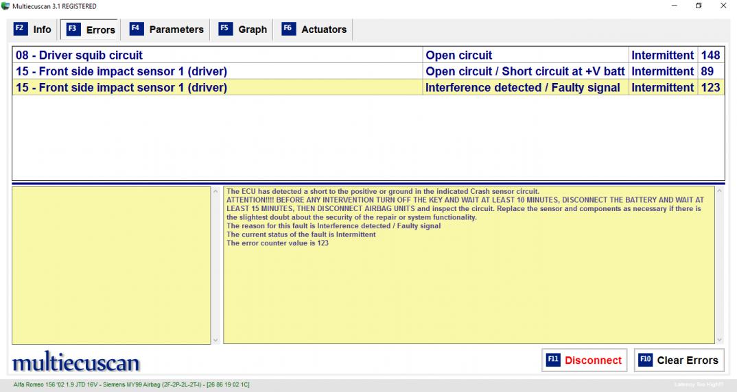 Włoszkę dopadł kilka dni temu syndrom świecącej kontrolki poduchy. Lampka zapaliła się z niczego w trakcie jazdy. Po godzinnym boju z kabelkiem i laptopem udało mi się w końcu podłączyć i znaleźć trzy błędy, ALE - co najciekawsze - kontrolka zdążyła sama zgasnąć ZANIM uzyskałem połączenie z ECU. Skasowałem błędy (w załączniku), a dziś powtórka: w drodze do fabryki kontrolka się zapaliła. Po 8 godzinach postoju, gdy przekręciłem kluczyk, kontrolka dalej się paliła, po czym... zgasła jak tylko ruszyłem z miejsca. Po powrocie do domu, znów przez godzinę próbowałem podłączyć komputer, ale tym razem bezskutecznie. Jedyne co udało mi się osiągnąć w trakcie podłączania to... ponowne zapalenie lampki.