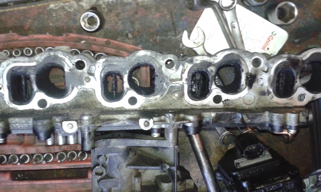 Po kolei. Jako, że auto posiadam od nie dawna to przy okazji wymiany rozrządu postanowiłem zerknąć czy u mnie ciągle są i w jakim są stanie klapy wirowe. Po rozebraniu wszystkiego okazało się, że samych klap już nie ma ale cały mechanizm sterowania pozostał, zdjęcie przed myciem wszystkiego jak to wyglądało u mnie: