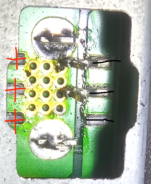 Przerywa mi jeden xenon. Na początku stwierdziłem, że brakuje masy. Wolałem niczego nie rozbierać i po prostu podałem osobnym kablem masę na obudowę przetwornicy. Pomogło. Po paru latach problem wrócił. Tym razem odważyłem się na wnikliwsze oględziny. Dotarłem do wtyczki z dwoma kablami (czerwonym i czarnym) zasilającymi przetwornicę. W międzyczasie znalazłem na forum pewne szczątkowe informacje o tym, że ta wtyczka to popularny problem i w sumie wszyscy to wiedzą. Ale nie znalazłem o tym, jak sobie poradzić z tematem. Po delikatnym wypięciu wtyczki oczom mym ukazał się następujący widok (nie mogłem złapać ostrości sensowniej, ale w miarę to widać):