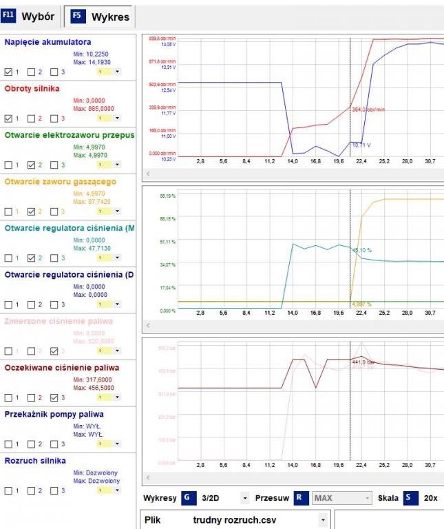 Regulator na pompie bym wykluczył bo jak widać sygnał z regulatora wstaje od razu po rozpoczęciu rozruchu co również potwierdza czujnik ciśnienia na szynie. Także skoro paliwo jest od razu podane to tym siwym bąkiem też się nie przejmuję.