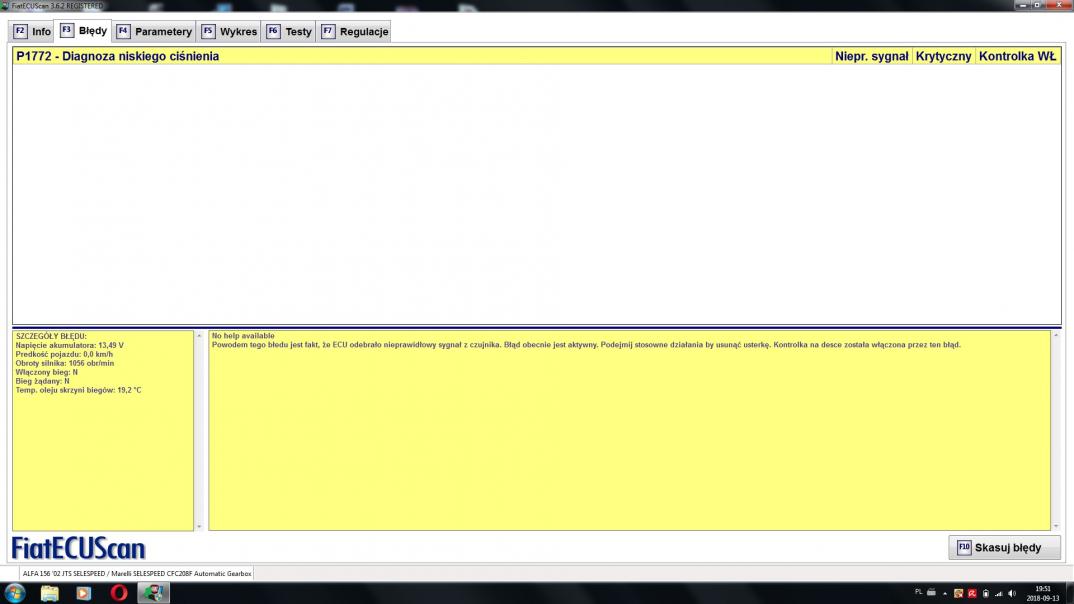 Dzisiaj wlałem olej, pogrzebałem w komputerze. Samochód odpalił, były biegi 1,2,3,R. Nawet udało mi się ruszyć do przodu, tyłu ale szybko zaświeciła się kontrolka awarii skrzyni i biegi przestały wskakiwać. Podłączyłem komputer i pokazało błąd nieskiego ciśnienia. Zauważyłem, że olej uciekł, lecz chciałem zapytać czy to tylko nieszczelność czy podejrzewacie jeszcze jakąś inną usterkę?