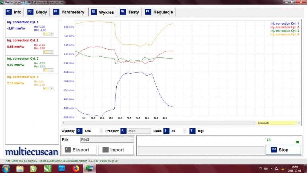 Korekty sprawdzone, silnik ciepły. Na wykresie jest drugi pomiar, po ponownym odpaleniu silnika. Niestety nie mam zrzutu z pierwszego pomiaru jak się pojawiły drgania, ale nie było dużych różnic (po pierwszym pomiarze zgasiłem silnik i odpaliłem ponownie drgania ustały).