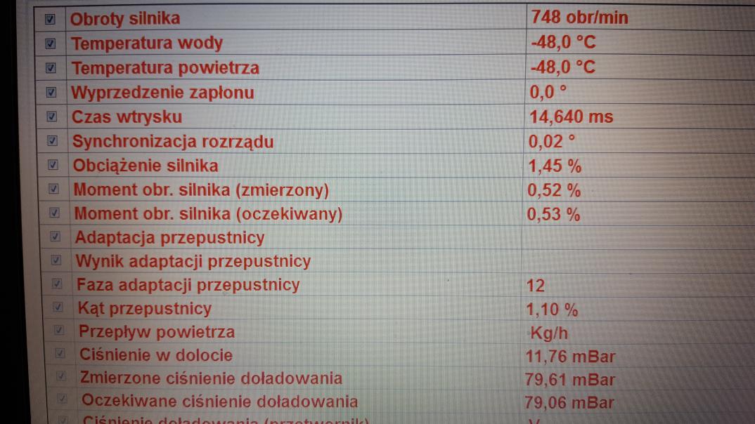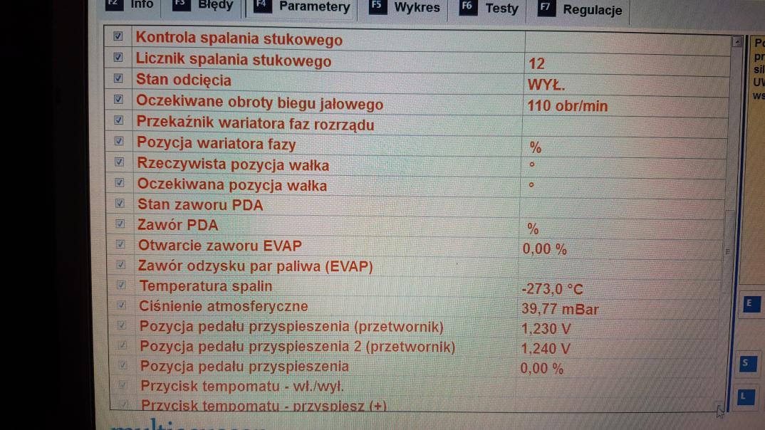 Ciśnienie też mocno zaniżone: powinno byc okolo 1000 mbarow. Nie wiem co jest, ale chyba raczej cos z softem lub adapterem/kablem. Niektorych parametrow nie rozpoznaje. Ktora wersja, a moze to nie giulietta?