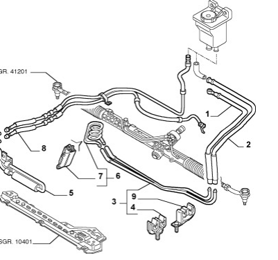 Zauważyłem wyciek płynu z układu kierowniczego. Mocno poci się przewód dolny oznaczony na rysunku cyfrą 8. Z jednej strony wchodzi do chłodnicy a druga końcówka na tym rysunku jest w "powietrzu". Pod blokiem nie mam jak tego zobaczyć. Czy ktoś wie gdzie podłączona jest druga strona tego przewodu i czy łatwo to wyciągnąć?