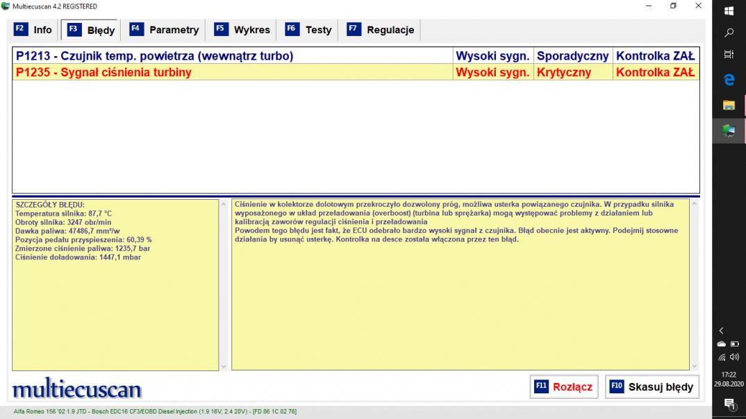 Witajcie. Niedawno zaślepiłem i usunąłem programowo EGR. Błąd żaden się nie pojawiał, aż do czasu. Auto zaczęło tracić na mocy głównie na wyższych obrotach 3-3,3k. Jadąc 80km/h i więcej przy tych obrotach wywala Check Engin kodem P1213 i P1235 w programie Multiecuscan.