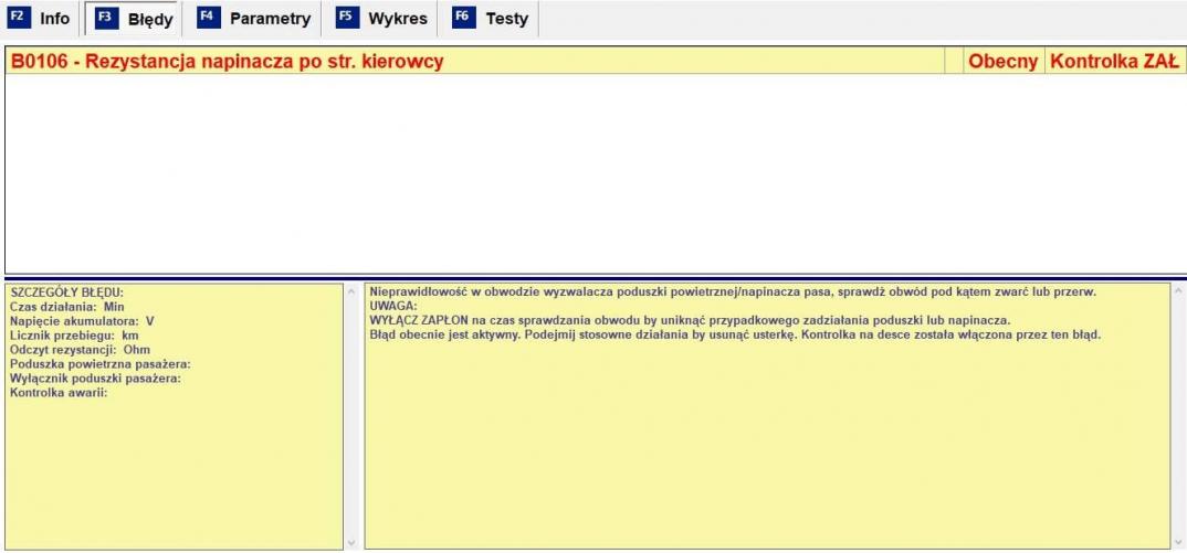 Probowalem skasować błąd ale od razu powraca i zapala się kontrolka od poduszek