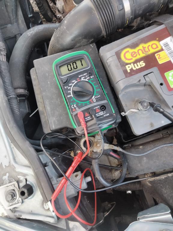Miernik między minus w Aku a kleme w instalacji auta. Kontrolowałem tak prąd przez godzinę. Według mnie pobór 0.01 A nie może Aku w godzinę rozładować.