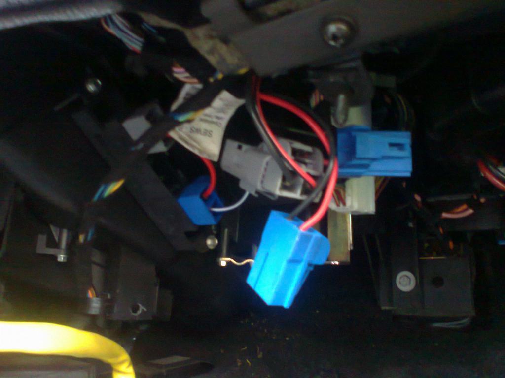 3. Po zdjęciu tapicerki pod schowkiem znalazłem luźno wiszące niebieskie złącza. Na zdjęciu widać też że za nimi, pomiędzy niebieską a szarą kostką jest wolne miejsce do wpięcia. Od czego te niebieskie??