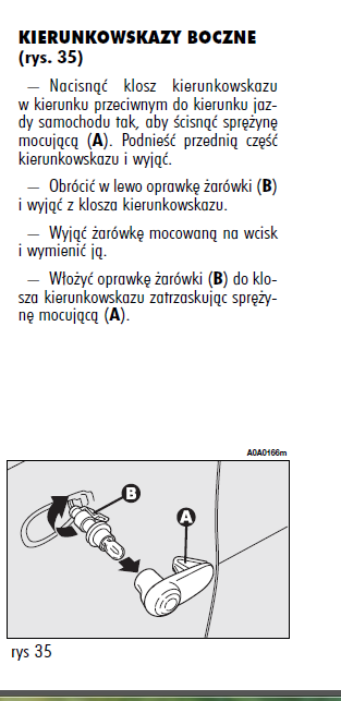 ja dostawałem się od spodu nadkola tam jest taki zaczep plastikowy trzeba przycisnąć i wypchać do przody cały kierunek wychodzi a od spodu kierunkowskazu jest wtyczka i tam jest żarówka.