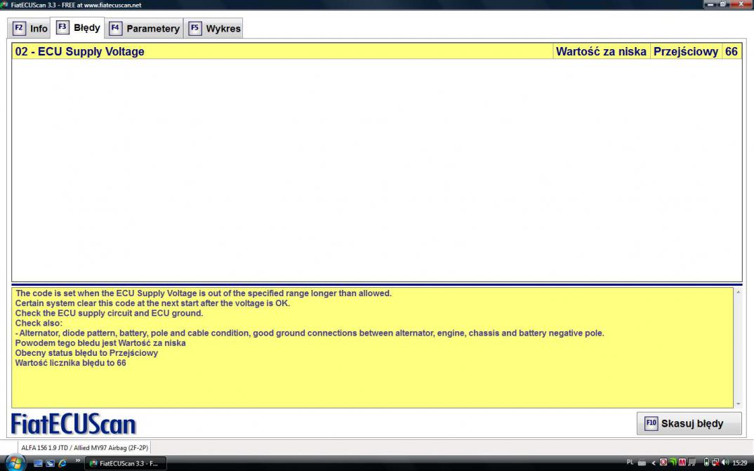 za niskie po wyłączeniu silnika. PO jakim czasie masz takie niskie napiecie na aku? Spróbuj go podładowac przez 12godz. maksymalnie małym prądem. Jaki masz aku i jaki jego wiek? Mi wyswietlało ten błąd jak miałem zwarcie wewnetrzne w aku, przez co w zimie cieżej krecił, a nie raz wcale nie zakrecił. Wymiana aku pomogła.