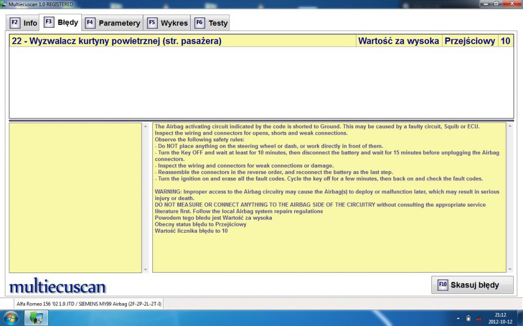 Połączyłem się z komputerem przez program FiatECUScan i wyświetliła się informacja 22 - Curtain airbag squib (passenger) wartość zawysoka obecny 44. Pomyślałem że jest to błąd kurtyny bocznej więc dobrałem się do tylnej kostki w bagażniku (od kurtyn Alfa 156 SW), ale obejście kostki i z lutowanie przewodów na stałe nic nie pomogło. Nadal nie mogłem wykasować błędu. :(