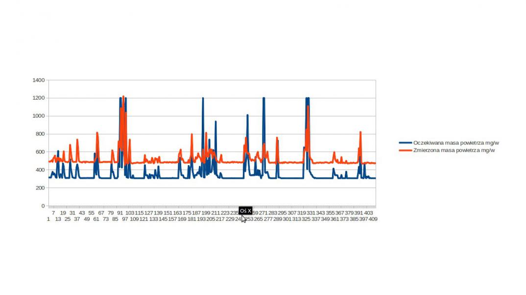 Ogólnie wygląda to tak, że "zmierzona wartość powietrza" jest kilka razy mniejsza od "oczekiwanej wartości powietrza". Kształtem wykresy tych parametrów wyglądają podobnie, jednak dzieli je rząd wielkości. Nie znam się na tym w takim stopniu, żeby coś jednoznacznie określić, ale oglądając wykres wydaje mi się, że przepływomierz nie działa prawidłowo....Cytat: