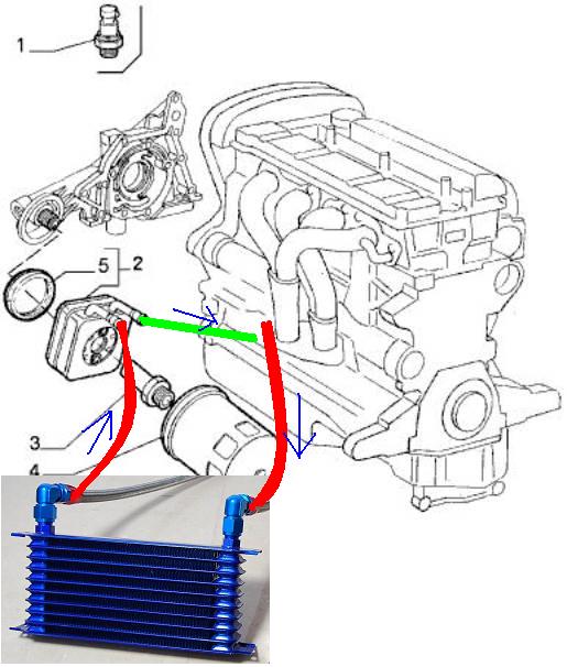 To czerwone na rysunku to przewody chłodnicy oleju? Jeśli tak to będziesz chłodził dodatkowo wodę a nie olej. Żeby ją podłączyć musisz pod filtr założyć podstawkę i chłodniczkę do niej. Na zdjęciu wyżej jest w "zestawie".