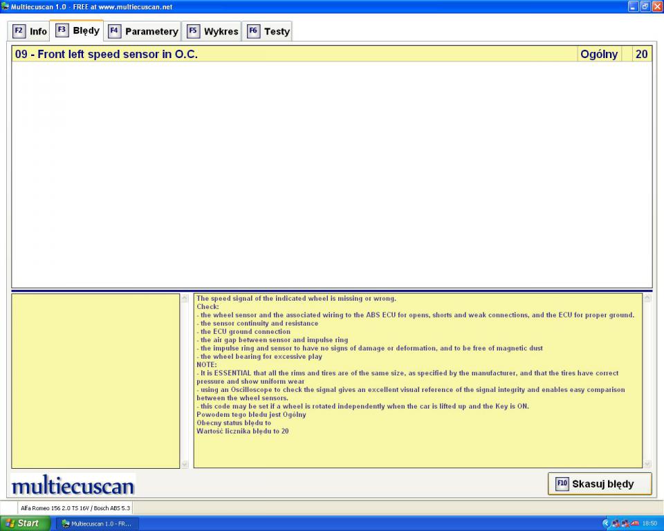 Z zakładki FES'a "ABS" wyskakuje natomiast taki oto błąd - "" 09-front left speed sensor in O.C."