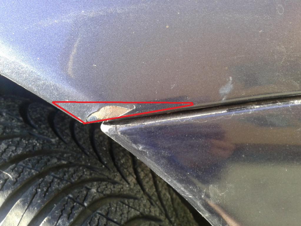 Ja bym papierem ściernym to wyczyścił, tak żeby już nie odpadał lakier dalej, bo tu napewno palcem możesz odrywać go dalej.. i wtedy jak lakier przestanie odpadać to matowisz znów papierem, troszkę podkładu i potem lakier.. wyjdzie zaprawka o kształcie trójkąta jak na foto niżej.. i powinno być ok..