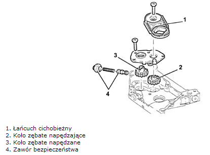 Pompa napędzana jest łańcuchem 'cichobieżnym' (1), który przenosi napęd z wału korbowego na koło zębate, napędzające (2) pompy.