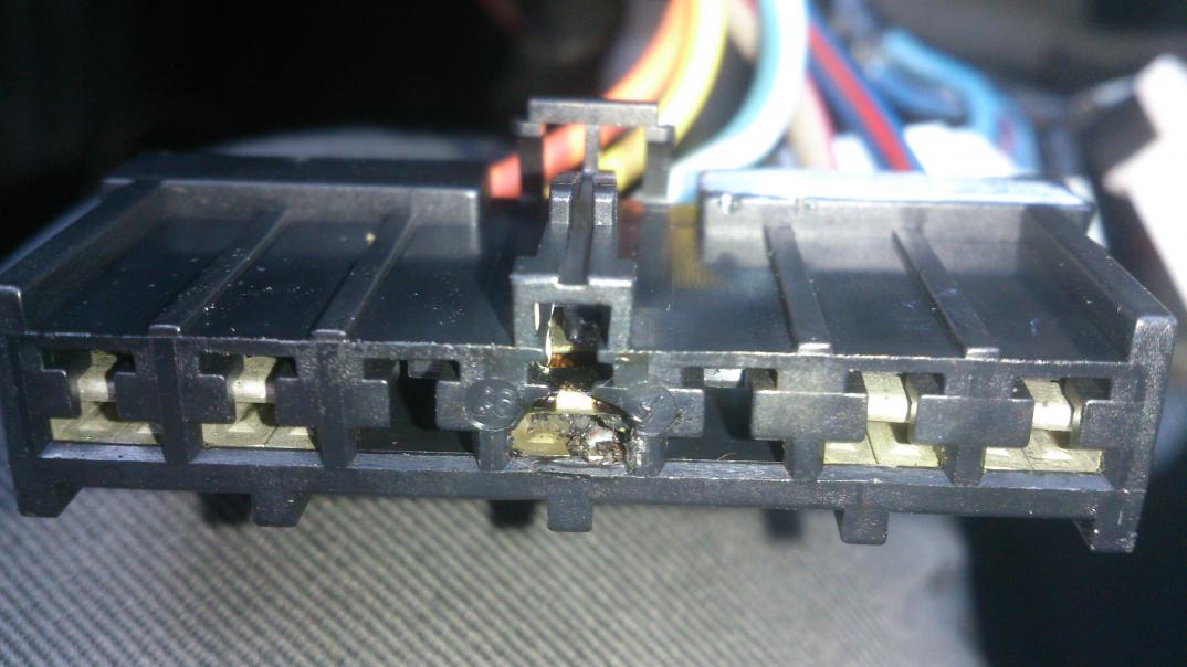 Co udało mi się dalej ustalić (dojrzeć) na kostce którą odłączyłem od przełącznika zespolonego (tej odpowiedzialnej za światła) dojrzałem przegrzanie, stopienie jej, tak samo „młoteczek” w przełączniku widać że się stopił (zdjęcie).