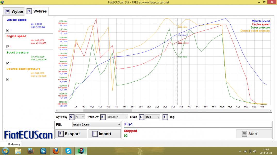 Powyżej wykres, co ciekawe na 4 biegu widac jak jest chwilowy spadek ciśnienia i obrotów a trzymam pedał gazu wciśnięty w podłogę.