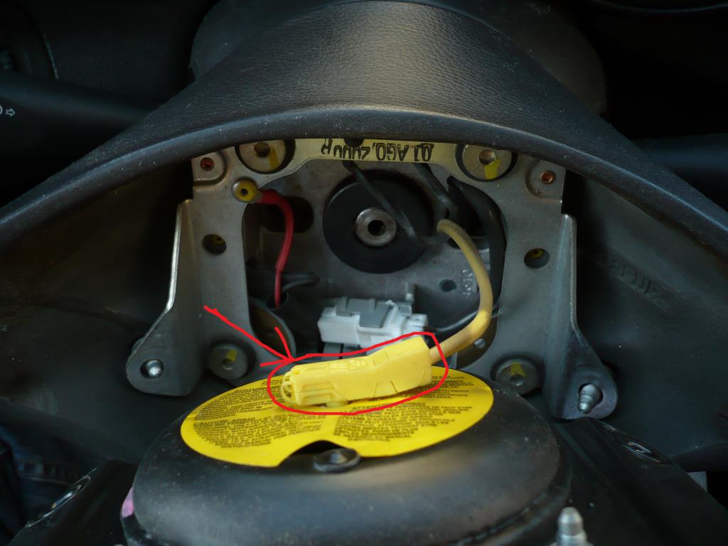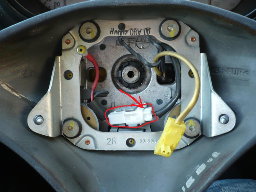 Krok 2. Odchylamy poduszkę powietrzną i odpinamy przewód (żółty) jest montowany na wcisk, następnie odpinamy przewód klaksonu (biały) i ściągamy zaślepkę (śrubokręt płaski)