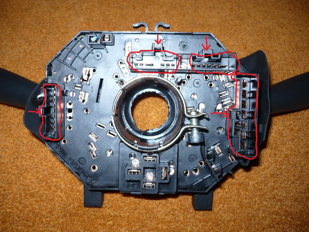 Krok 4. Następnie odkręcamy i luzujemy metalową obejmę która znajduje się z tyłu przełącznika zespolonego (imbus 5), widok z przodu rys.1 i z tyłu rys.2, później wypinamy 4 wtyczki - na rysunku strzałkami oznaczyłem miejsca gdzie trzeba nacisnąć zatrzask.